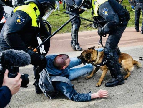 В сети свежее видео из Голландии: перекресток двух больших улиц, на нем прямо на трамвайных путях пожилой лысый мужчина в окружении полицейских в шлемах, бронежилетах и с рвущимися с поводков собаками. Человек пытается закрыть свою голову рукой от ударов резиновыми дубинками. И вот уже ладонь мужчины в пасти одной из громадных разъяренных немецких овчарок – видимо, одного из отпрысков четвероногих охранников фашистских лагерей. Мужчина жутко кричит от боли и страха и пытается освободить свою ладонь из зубов зверя. А окружающие его полицейские в это время дубасят его длинными резиновыми "демократизаторами".