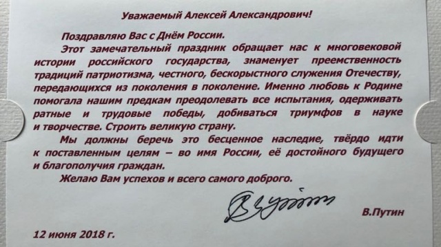 В поздравительном письме говорится: "Этот замечательный праздник обращает нас к многовековой истории российского государства, знаменует преемственность традиций патриотизма, честного, бескорыстного служения Отечеству, передающихся из поколения в поколение.