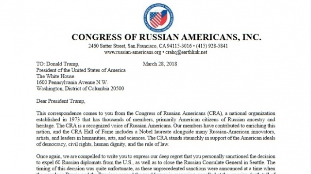 Обращаемся к Вам от лица Конгресса русских американцев (КРА), общеамериканской организации, созданной в 1973 году, в которой состоят несколько тысяч членов, в основном это американские граждане русского происхождения. КРА является признанным голосом русских американцев. Мы внесли свой вклад в обогащение Америки, а среди членов КРА Вы найдете как лауреата Нобелевской премии, так и многочисленных русско-американских инноваторов, художников и выдающихся деятелей гуманитарных наук, искусств и наук. КРА всячески поддерживает американские идеалы демократии, гражданских прав, человеческого достоинства и верховенства закона.