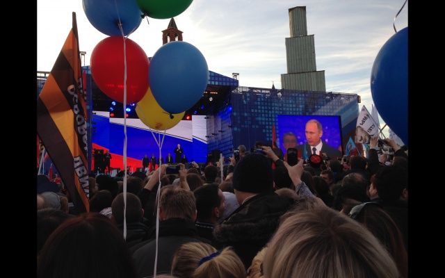 В финале акции со сцены к собравшимся обратился президент России Владимир Путин. "Ровно год назад вот в эти дни, народ российский продемонстрировал удивительную собранность, удивительный патриотизм", - отметил президент.