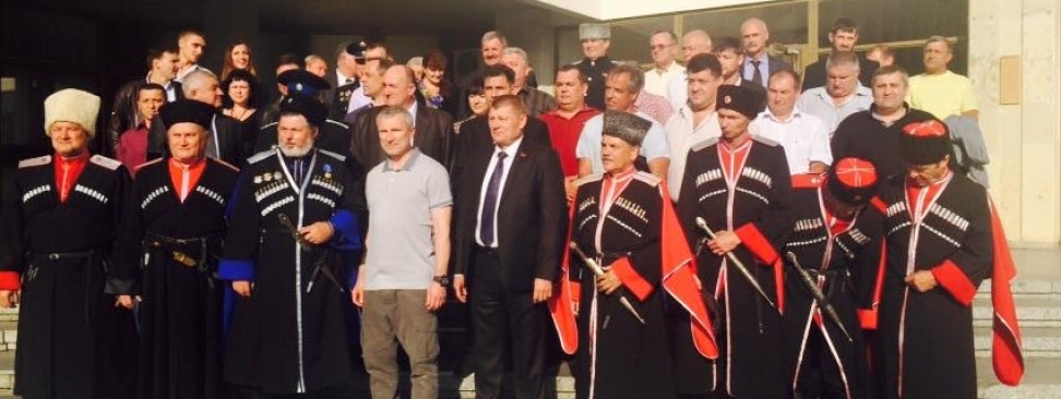 На фото: Алексей Журавлёв с руководством и активом ставропольского регионального отделения партии "РОДИНА" во время визита в Ставропольский край 30 сентября 2015 г.