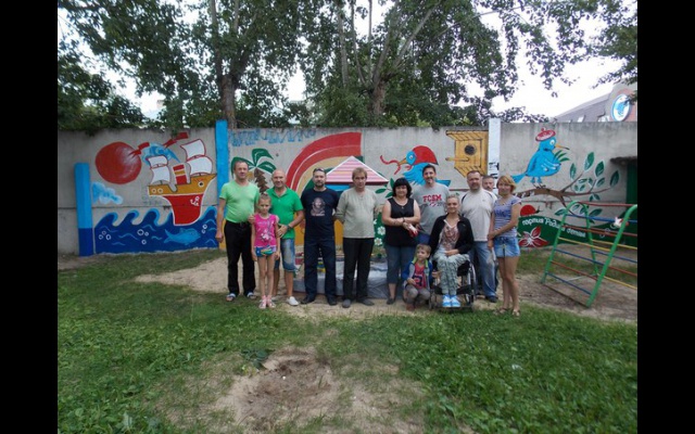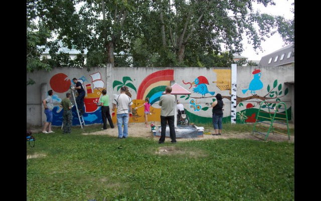 Долгое время в детском садике № 23 г.Дзержинска стена, отделяющая их от офиса компании "Тосол-синтез", была просто серой, мрачной поверхностью. Руководство садика, родители и дети мечтали преобразить бетонные плиты в приятный окрас.