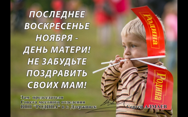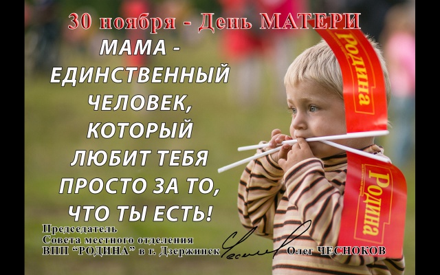 Председатель дзержинского местного отделения партии "РОДИНА" в Нижегородской области Олег Чесноков поздравляет всех матерей с замечательным праздником - Днём матери.