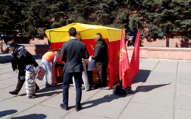 29 апреля омские социал-патриоты приобщились к акции "Нерушимый Союз". На площади у ТЦ "Омский" была выставлена палатка партии "РОДИНА", где каждый подписавший открытку с пожеланиями ветерану Великой Отечественной войны, проживающему на Украине, мог получить георгиевскую ленточку и флажок партии "РОДИНА".