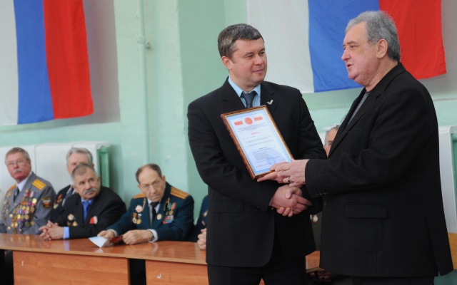 Валерий Барсук поблагодарил директора Школы № 170 Александра Моисеенко за большой личный вклад в военно-патриотическое воспитание молодежи и вручил ему почетную грамоту Думы городского округа Самара за заслуги перед городским сообществом.