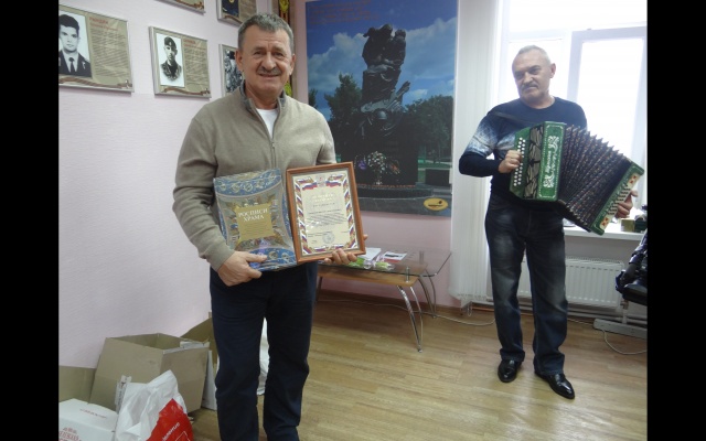 В дополнение к поздравительной речи Трифонов вручил 6 микроволновых печей, а также 25 продуктовых наборов.