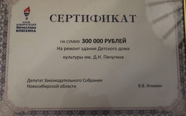 Вячеслав Илюхин подарил коллективу акустическую и вокальную системы для живого вокала, микрофоны и стойки под них, а также вручил сертификат на 300 000 рублей для ремонта ДДК. Эти средства Вячеслав Илюхин выделил из своего депутатского фонда.
